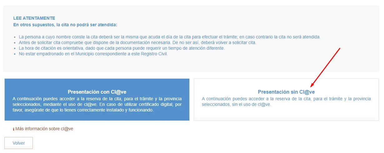 Lo más rápido sería con Cl@ve pin, pero hay muchas personas que no tienen, en este caso nosotros vamos a seleccionar la opción de «Presentación sin Cl@ve».