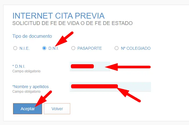Es hora de que rellenes los datos que se te solicitan: Tipo de documento, número de documento, nombre y apellidos. Posteriormente, haz clic en «Aceptar».
