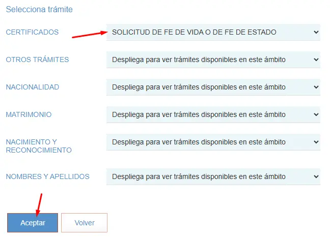 Selecciona el trámite: SOLICITUD DE FE DE VIDA O DE FE DE ESTADO