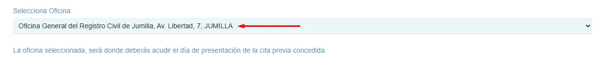 Una vez seleccionada la provincia, se abrirá una nueva opción para seleccionar tu oficina: selecciona la tuya.